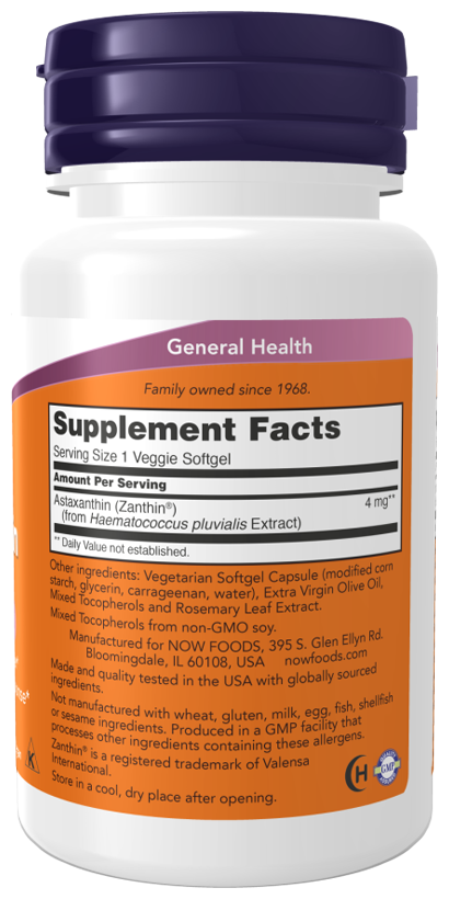 Астаксантин - это природный каротиноид, который благодаря своей уникальной структуре играет важную роль в защите клеток от свободных радикалов и здоровых реакциях иммунной системы.Now Астаксантин получен из микроводорослей Haematococcus pluvialis, не содержащих ГМО.