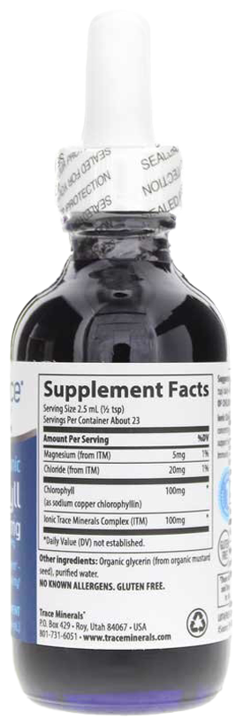 Trace Minerals Ionic Chlorophyll обеспечивает терапевтические свойства хлорофилла плюс концентрированный комплекс ионных микроэлементов полного спектра. Вместе они помогают поддерживать здоровье клеток, детоксикацию, регулирование веса, пищеварение, иммунитет и минеральный баланс организма.