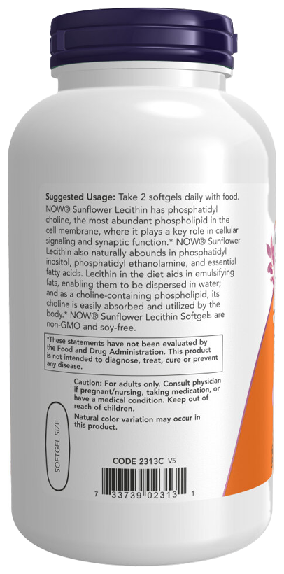 Подсолнечный лецитин содержит фосфатидилхолин, самый распространенный фосфолипид в клеточной мембране, который играет ключевую роль в сигнальной и синаптической функции клеток. Кроме того, подсолнечный лецитин содержит большое количество природного фосфатидилинозитола, фосфатидила этаноламина и незаменимых жирных кислот. Лецитин в рационе помогает эмульгировать жиры, позволяя им растворяться в воде. Организм с легкостью усваивает и использует холин, содержащийся в этом фосфолипиде.