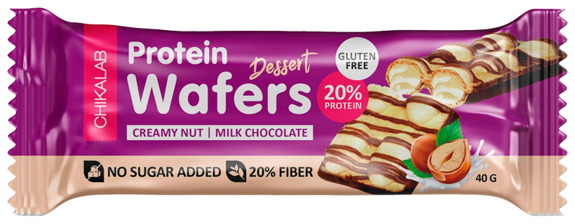 Chikalab Protein Wafers Dessert - двойная вафля с нежной сливочной начинкой, дроблёным фундуком и натуральным молочным шоколадом. Хрустящие подушечки без глютена и добавленного сахара содержат 8 г белка в каждой порции.